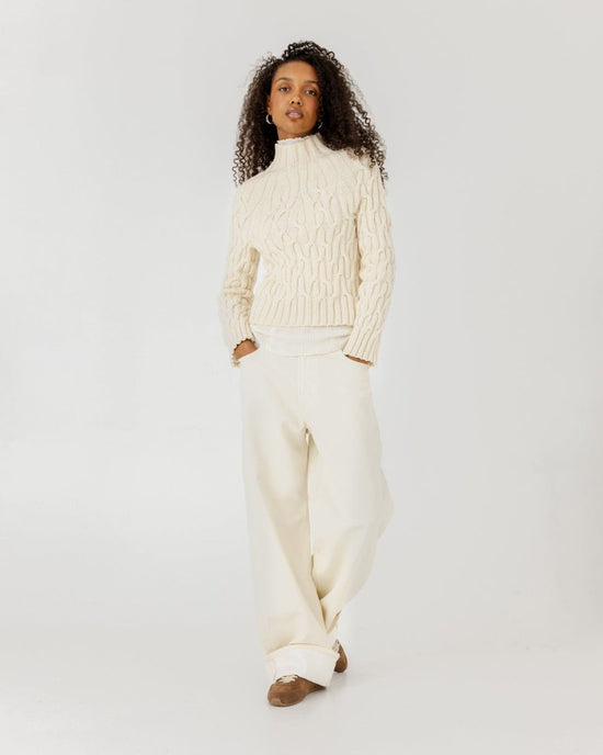 Inspired by their rhythm and movement, each cable twists and flows around the body, forming its own unique pattern. Hand-knitted over 40 hours from chunky 100% RWS-certified merino wool, Bangos is crafted seamlessly using circular needles - a zero-waste piece of modern craftsmanship. A sculptural, statement sweater, like the waves she’s named after, no two Bangos are ever the same. Runs true to size.