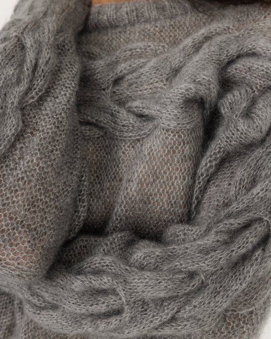 Jūra (meaning "sea" in English). Ultra soft silk-mohair cruelty-free certified blend moves like water, flowing seamlessly from one hand-knitted cable cuff to the other. Kind to skin, breathable, and subtly textured, this lightweight knit is as dreamy as the shores that shaped it. The airy knit makes it a go-to for layering across seasons. It takes 25 hours, more than 3 working days, to handcraft the Jūra from start to finish.