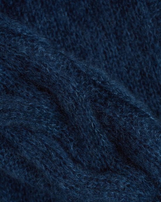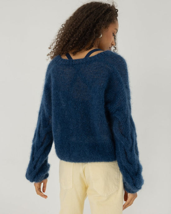 We call this cardigan Pagunda, the Lithuanian word for “lure.” In Lithuanian folklore, temptation is often cast as a force of nature - inevitable, undeniable. Crafted from mohair wool certified by the Responsible Wool Standard and silk, this navy knit is soft yet enduring. Its cable sleeves create an intricate rhythm, while the easy, hip-length fit makes it as wearable as it is alluring.