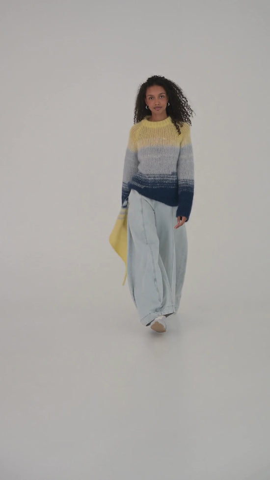 The ombré effect isn’t printed or dyed — it’s hand-engineered. Four different yarn shades are tied together as the sweater is knitted, often with three colors shifting in a single row. Knitted from a luxurious blend of RMS-certified mohair and cruelty-free silk spun in Italy, the silk strand binds the mohair for strength and a delicate sheen. The mohair is brushed for extra softness, giving the chunky knit an airy, feather-light feel. Featuring a round neckline and raglan sleeves.
